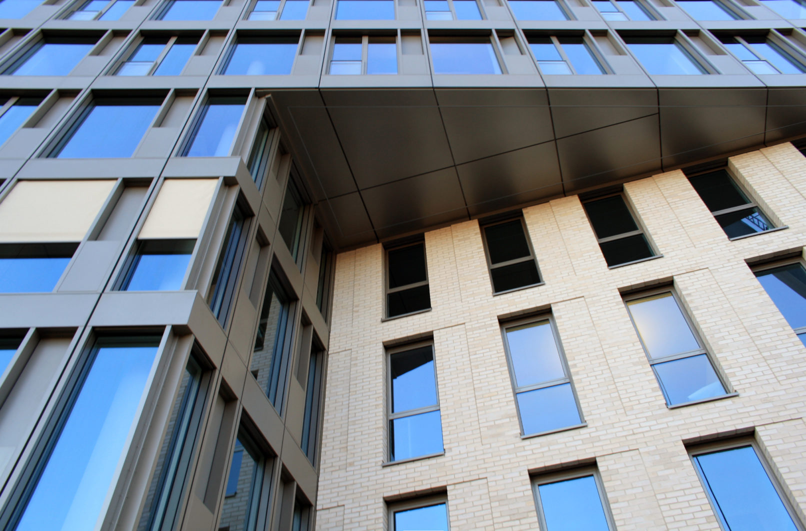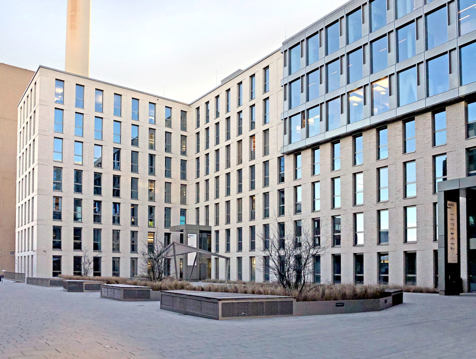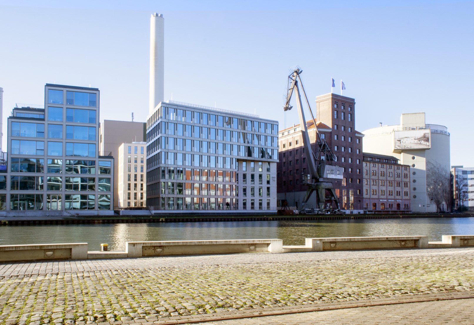 In Münsters Stadthafen, an prominenter Adresse zwischen dem Flechtheimspeicher und der Hafenkäserei, ist am Nordufer ein 7-geschossiges Bürogebäude entstanden. Das Gebäude besteht aus zwei ineinander verschränkten Elementen. Ein Steinernes und ein Gläsernes. So ist der Gebäudeteil zur Hafenseite transparent und offen gestaltet. Die Nordlage erlaubt an dieser Stelle eine großzügige Verglasung der Büros und einen imposantem Hafenblick ohne bei Sonnenschein eine Verschattung zu benötigen. Der steinerne Südbaukörper mit klassischer Lochfassade schützt dagegen die Arbeitsplätze durch reine Masse vor Aufheizung und dem Lärm des angrenzenden Kraftwerkes. Eine Betonkernaktivierung ist ein weiteres Medium, um mit wenig Technik ein ausgeglichenes Klima in den Büros zu erzeugen. Der steinerne Baukörper nimmt zudem die strenge Rechtwinkligkeit des benachbarten Denkmals auf, während der gläserne Baukörper, die Schräge der Hafenkante spiegelt.