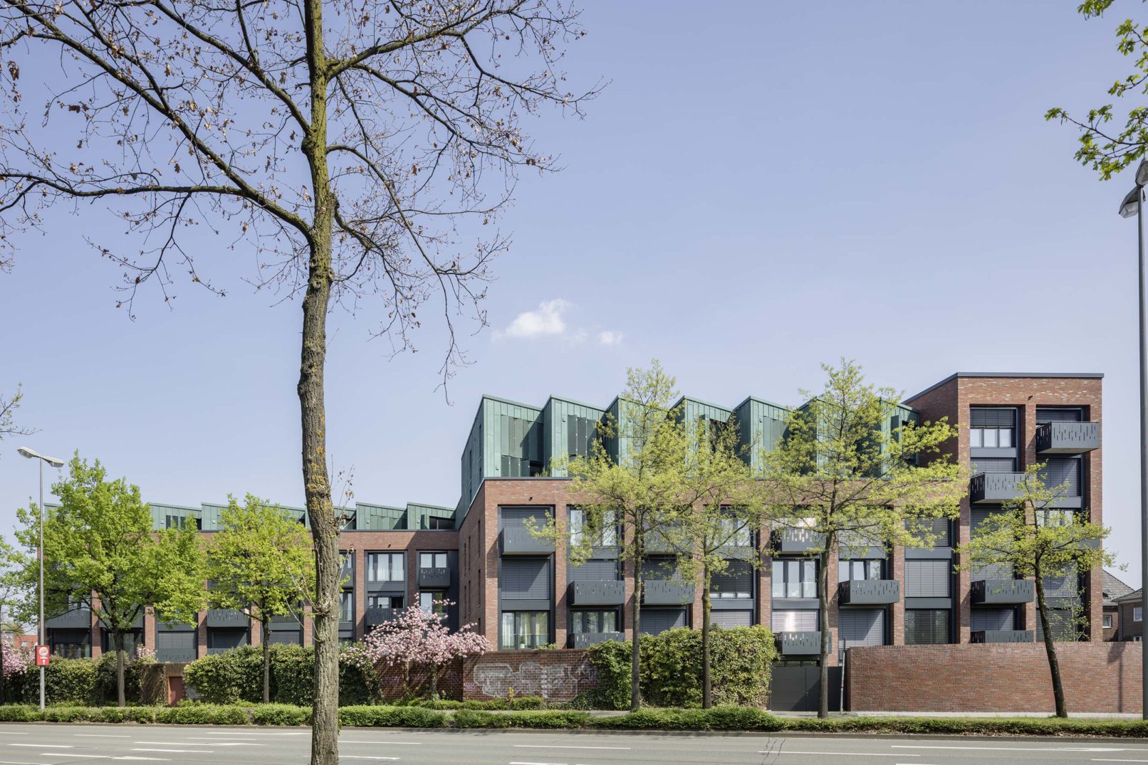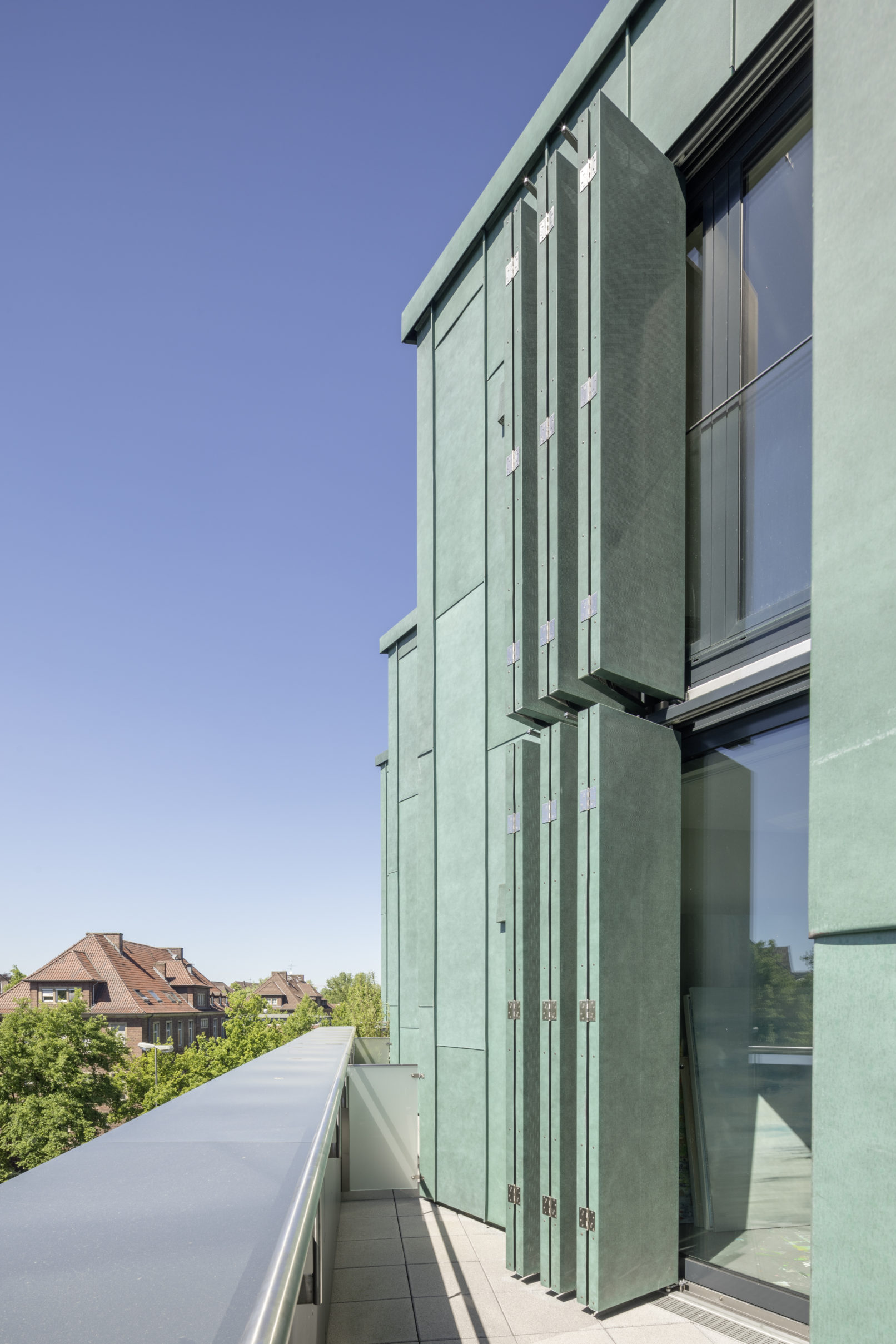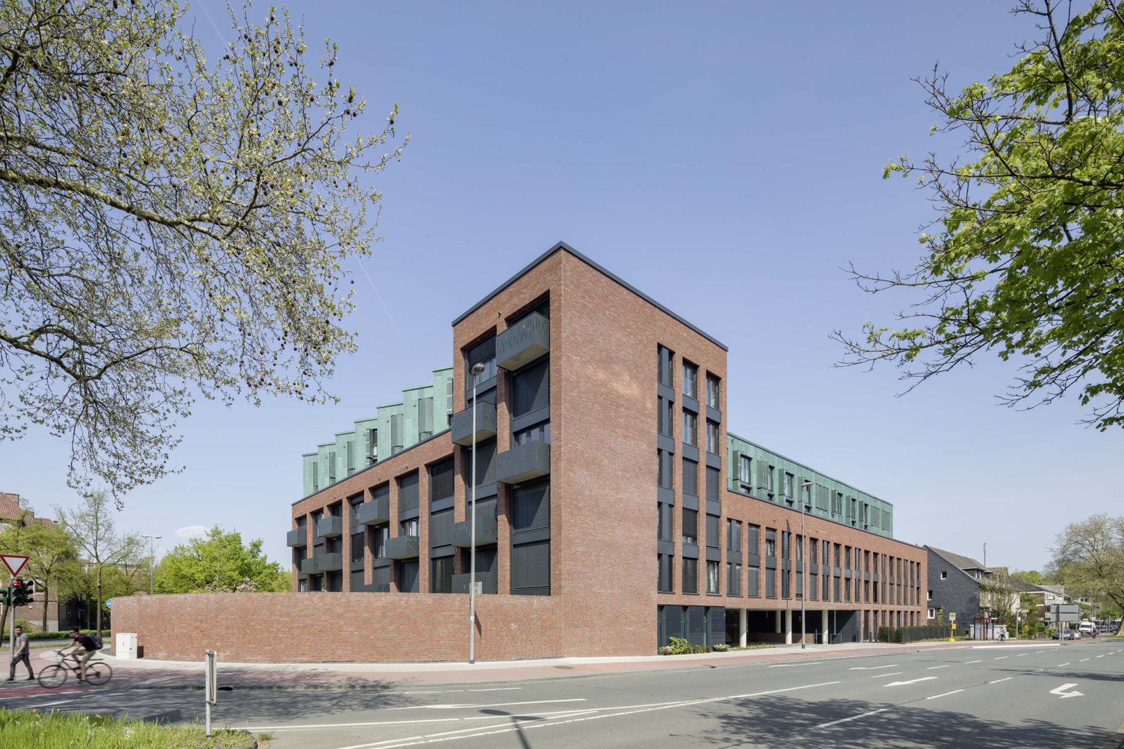 Dem architektonischen Anspruch der exponierten Lage wurde unter anderem durch die Verwendung hochwertiger Materialien wie z.B. patiniertem Kupfer und Wasserstrich-Klinker, welche sich an typische historische Münsteraner Bauten wiederfinden, Rechnung getragen.