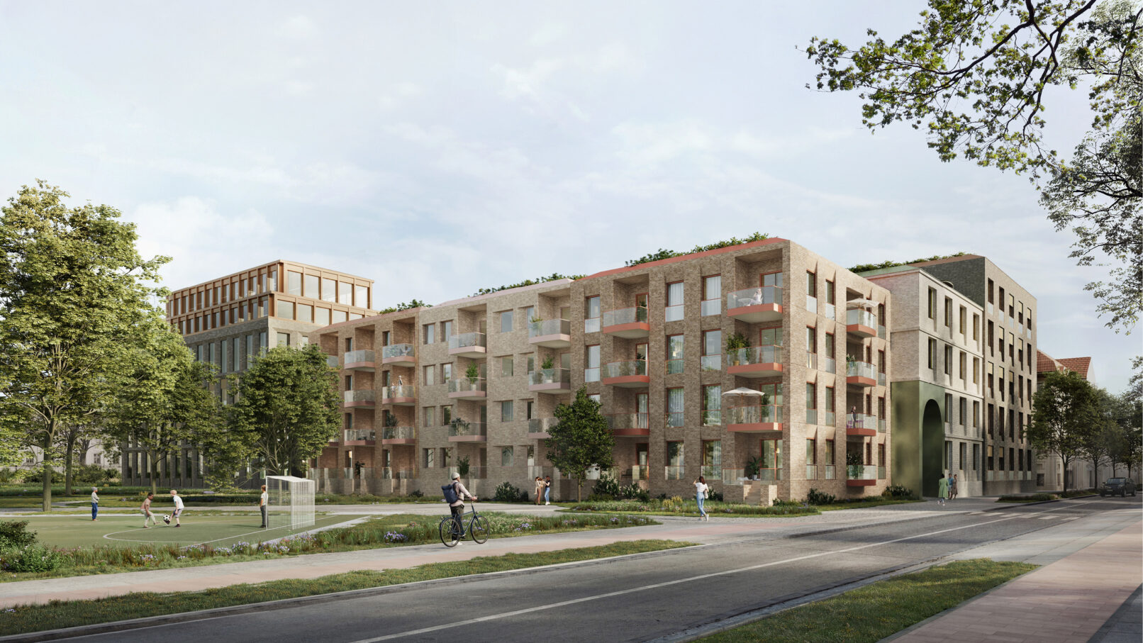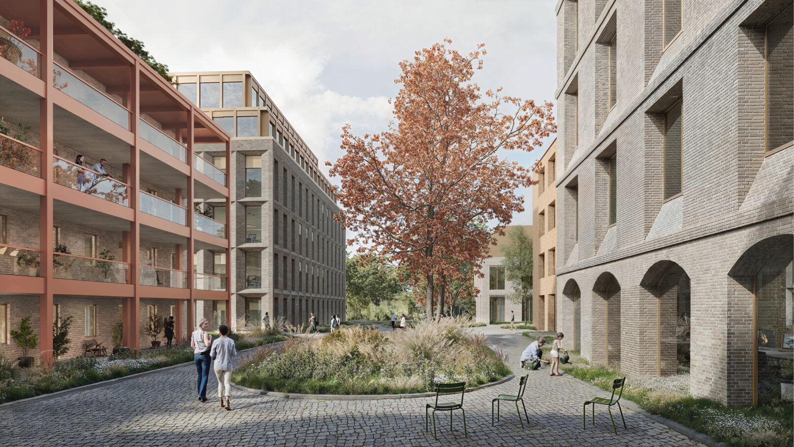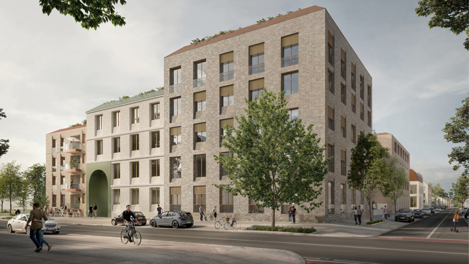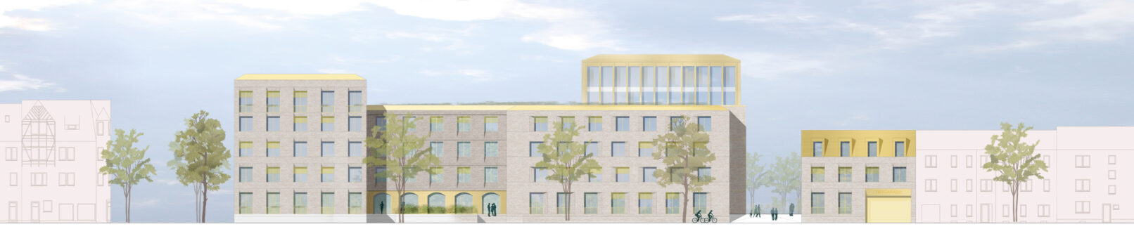 Architektonisch wird ganz ähnlich vorgegangen. Auch hier werden Charakteristika aus der Vorprägung fortgeführt. Großformatige Tordurchgänge und industriell anmutende Dachabschlüsse erinnern an das Werksgelände. Die Häuser erhalten eine klare Adresse und Orientierung, die den funktionalen Nutzungsmix zoniert und verbindet. Öffentliche und frequentierte Bereiche erhalten eine besondere Betonung. Trotz Vergangenheitsbezug wird nicht historisierend gearbeitet, sondern mit einer zeitgenössischen Antwort auf die Frage nach dem Fortbestand reagiert. Helle Klinkerfassaden mit großzügigen Fensterflächen und messingfarbene Metallbekleidungen definieren die Neubauten.