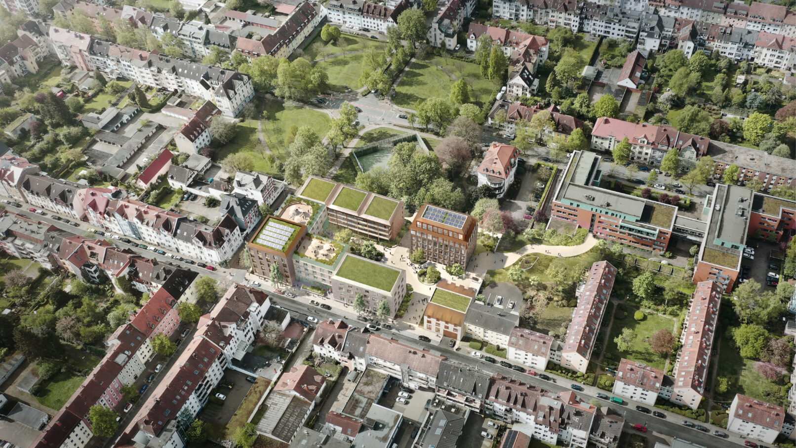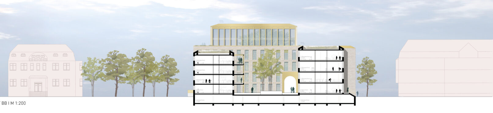 Grünräume erstrecken sich über die Höfe, Rücksprünge und Balkone hin zu den Dachgärten, die zusammen mit den erneuerbaren Enegieflächen den Abschluss bilden. Auf diese Weise kann ein ganzheitliches Projekt entstehen, dass die Qualitäten beider Zeiträume ausspielen kann – die der Vergangenheit und die der Zukunft.