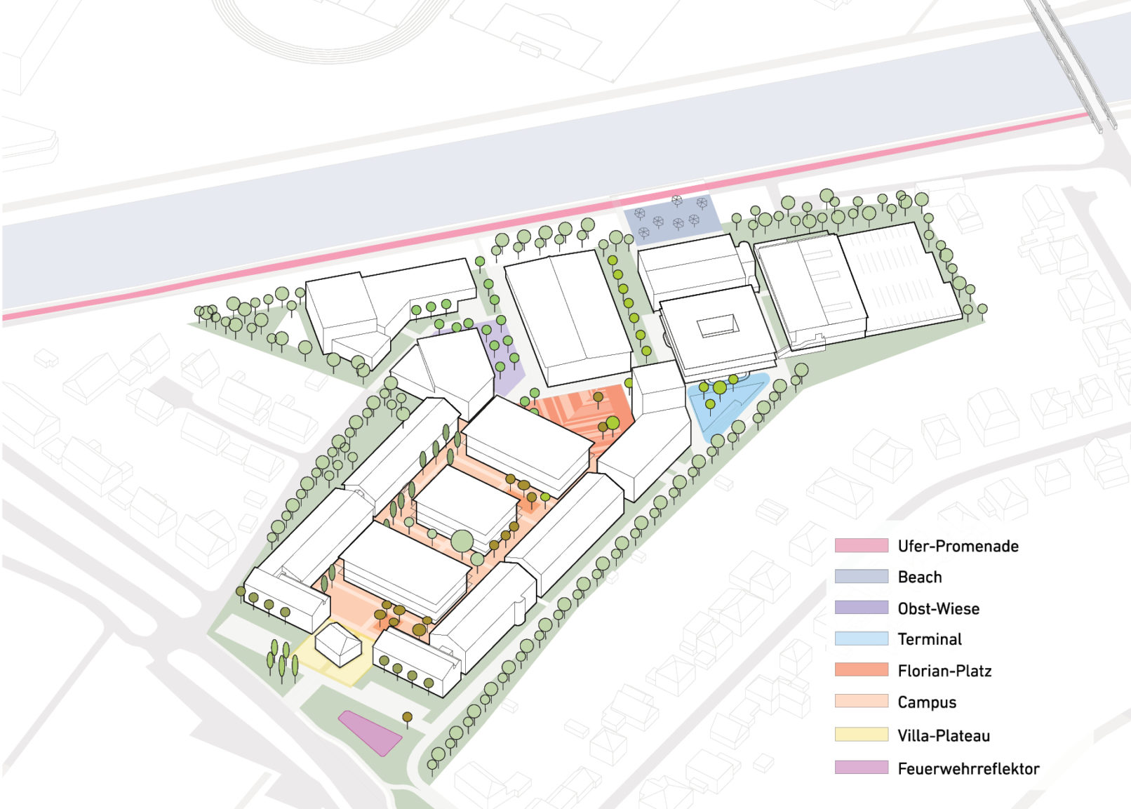 Diese Kombination erlaubt „neues Lernen und Arbeiten“ und bietet darüber hinaus flexible Erweiterungspotentiale für die Zukunft. Die bauliche Struktur folgt den Funktionsabläufen. So wird der Campus mit seinen öffnenden Lehrgebäuden im Zentrum durch die bestehenden und teilweise ergänzten Wohn- bzw. Internatsgebäude eingerahmt. Bereits vorhandene Unterkünfte werden an moderne Standards der Erwachsenenbildung angepasst. Alle neuen Zimmer sind Einzelzimmer und/oder barrierefrei bzw. als Familienzimmer konzipiert. Am Florian-Platz treffen die Funktionsbereiche aufeinander und leiten den Blick in Richtung Wasser, wo das gastronomische Angebot zu finden ist. Zum Dortmund-Ems-Kanal bildet das Stammgelände ein neues Gesicht aus, indem es sich zum Wasser hin öffnet. Weiter nordöstlich befindet sich die Sporthalle und das Terminal, welches erdgeschossig als Mobilitäts-Hub und Busbahnhof funktioniert. Direkt angebunden, erfüllt die neue Tiefgarage effizient die Anforderungen des ruhenden Verkehrs.