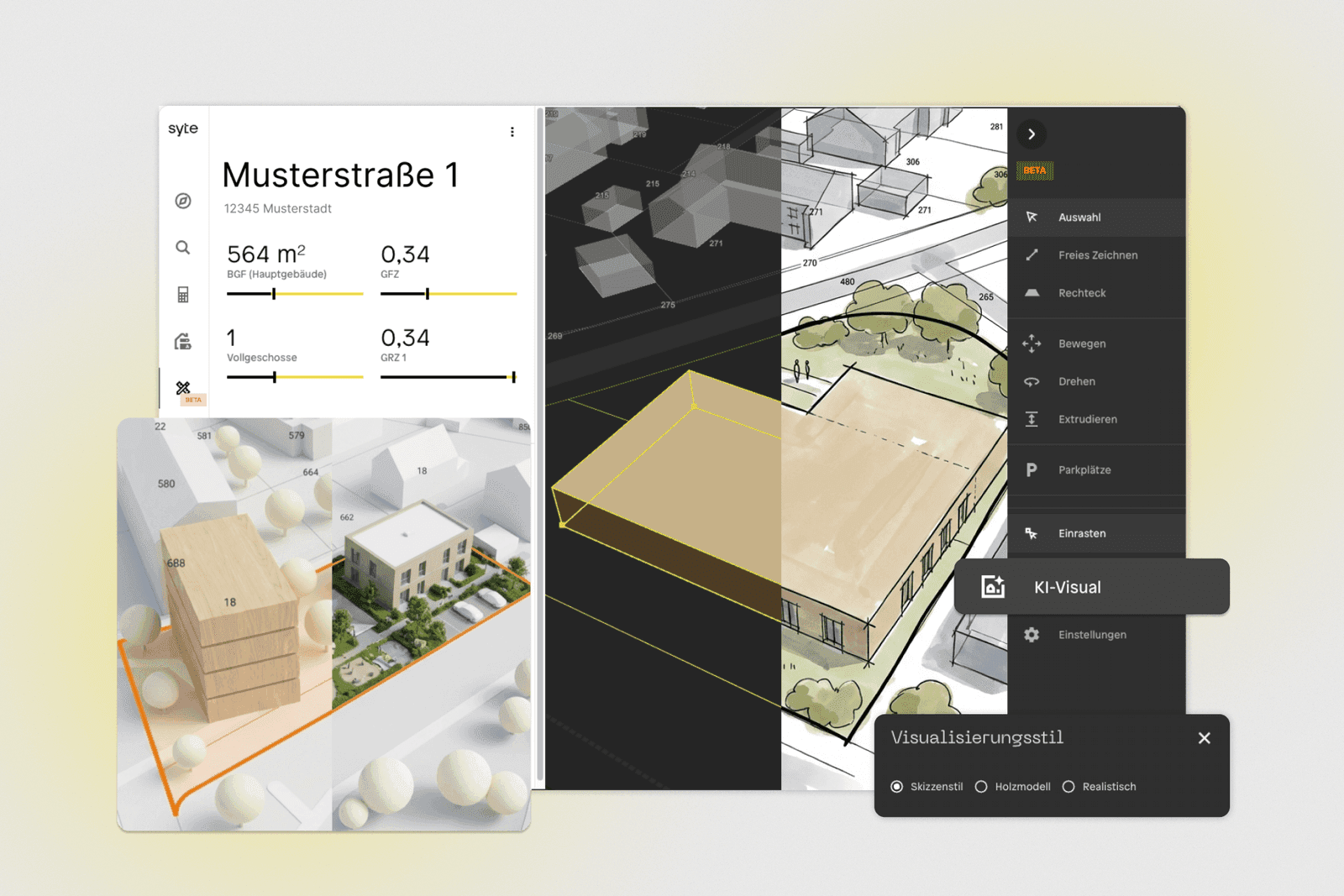 Ein weiteres zentrales Update betrifft die Kennzahlen. Während des Zeichnens aktualisiert syte automatisch Werte wie BGF, GFZ, GRZ und Vollgeschosse. Überschreitungen werden direkt sichtbar und mit Bestand sowie KI-Prognose abgeglichen. So entstehen früh belastbare Entscheidungsgrundlagen – noch bevor aufwendig weitergeplant wird. Ebenfalls neu sind die integrierten KI-Visualisierungen. Aus dem Entwurf lassen sich in wenigen Sekunden fotorealistische Darstellungen erzeugen – vom reduzierten Holzmodell über eine skizzenhafte Ansicht bis zur realistischen Visualisierung. Das erleichtert die Kommunikation in frühen Projektphasen erheblich, etwa gegenüber Gremien, Investoren oder Eigentümern.